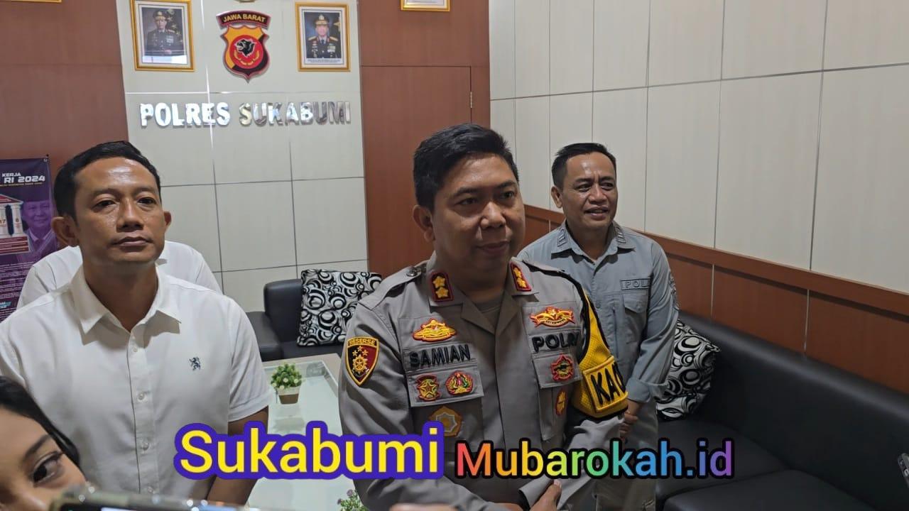 Kapolres Sukabumi, AKBP Samian, menyampaikan langsung keterangan kepada awak media. Saat diwawancarai, ia berdiri di tengah, didampingi di sebelah kanan oleh Kasat Reskrim AKP Hartono dan di sebelah kiri oleh Kasi Humas IPTU Ilham Permadi.