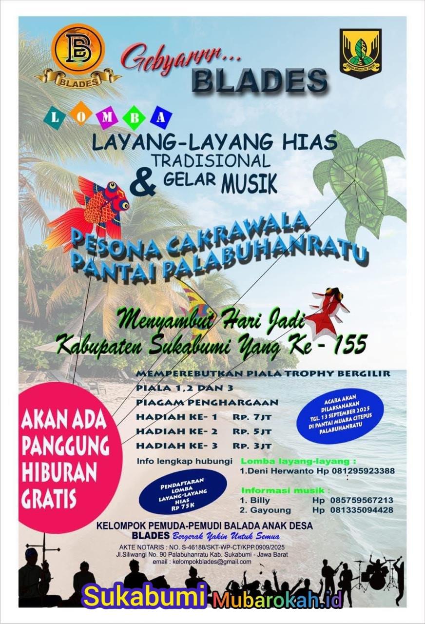 Dalam rangka Hari Jadi Kabupaten Sukabumi, pantai Muara Citepus akan menjadi saksi semangat anak muda yang berkibar di langit dan bergema di panggung. Perkumpulan pemuda BLADES mempersembahkan Festival Layang-Layang & Parade Band Karya Anak Sukabumi, sebuah perayaan budaya dan inovasi lokal yang digelar Sabtu pukul 13.00 WIB. Tak hanya menjadi ajang ekspresi, acara ini juga menghadirkan kompetisi berhadiah jutaan rupiah bagi para pemenang terbaik.