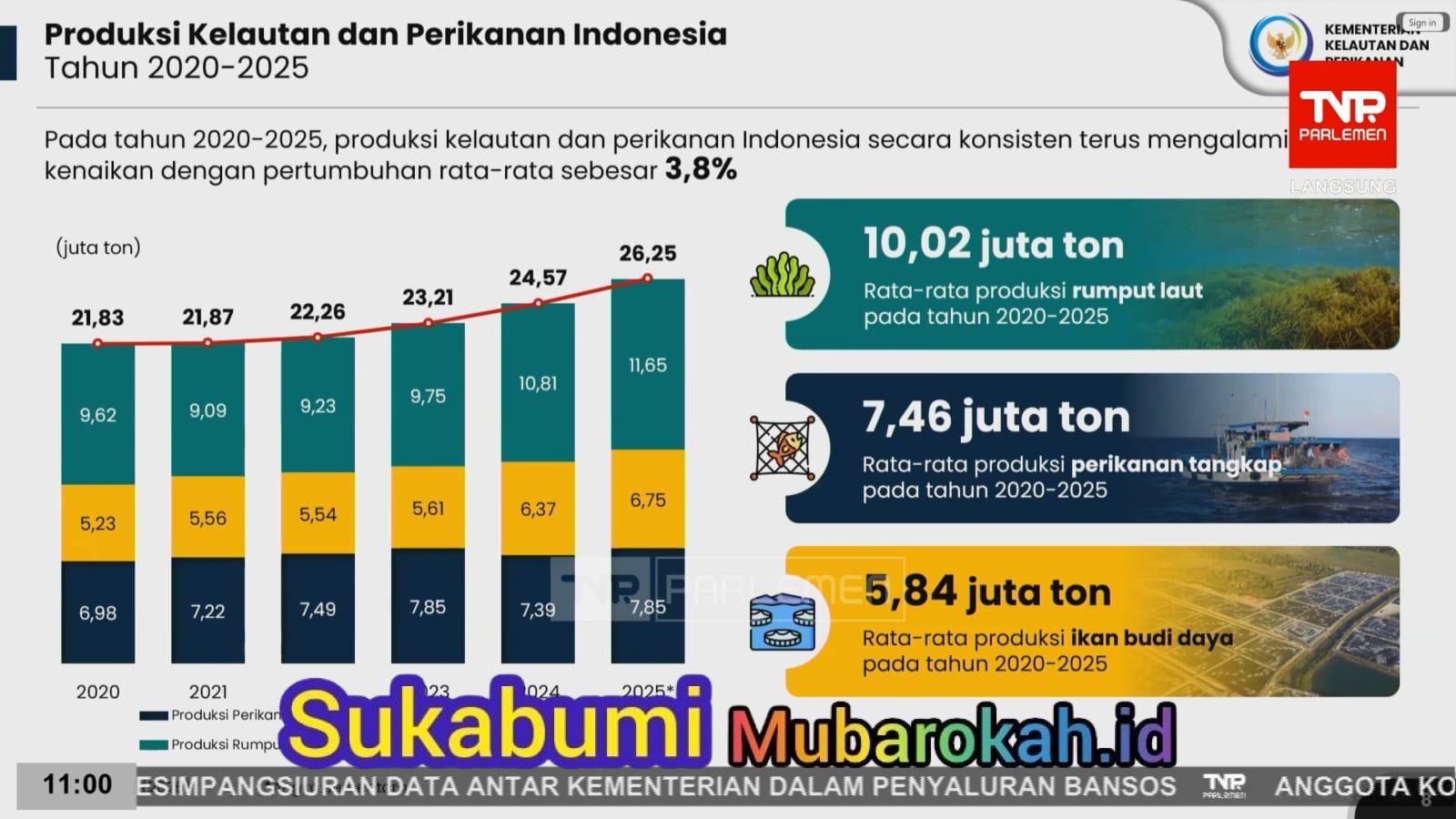 Berdasarkan data KKP, pada 2025, total produksi mencapai 26,25 juta ton, yang terdiri dari 11,65 juta ton rumput laut, 7,85 juta ton perikanan tangkap, dan 6,75 juta ton perikanan budidaya.