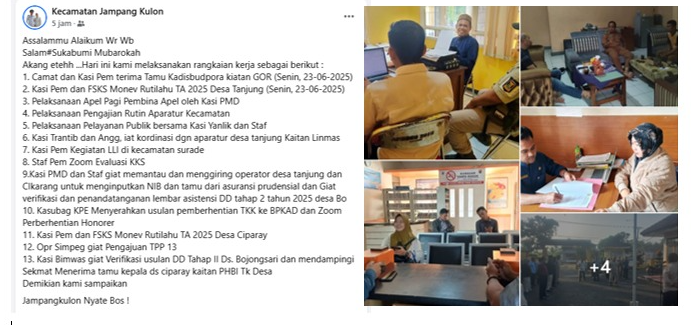 Sukabumimubarokah.id,– Jampangkulon, 25 Juni 2025 — Semangat pelayanan dan sinergi lintas sektor kembali ditunjukkan oleh jajaran Pemerintah Kecamatan Jampangkulon melalui rangkaian kegiatan yang padat dan produktif. Dalam unggahan resmi media sosialnya, pihak kecamatan menyampaikan berbagai aktivitas yang dilaksanakan sejak Senin, 23 Juni 2025 hingga hari ini.