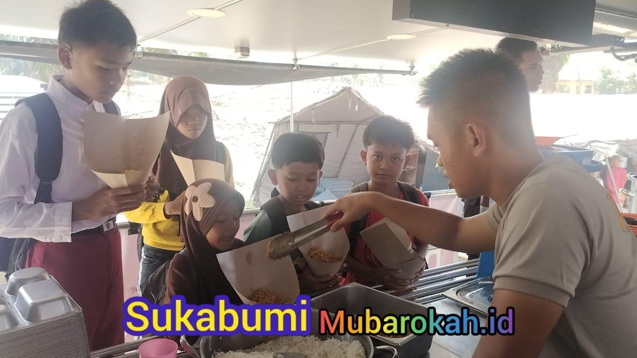Di dapur lapangan Posko Pengungsian Samsat Aceh Tamiang, suasana humanis tampak saat seorang anggota Polri melayani lima siswa yang mengantre sambil membawa nasi dalam bungkusan terbuka. Anggota tersebut dengan sabar membagikan lauk makanan kepada para siswa yang terdampak bencana.