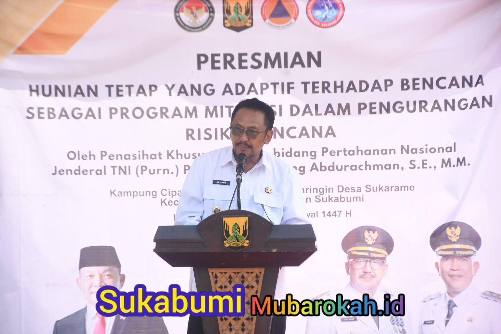 Sukabumi – Bupati Sukabumi H Asep Japar bersama Wakil Bupati H Andreas mendampingi kunjungan kerja Penasihat Khusus Presiden Bidang Pertahanan Nasional, Jenderal TNI (Purn.) Prof. Dr. H. Dudung Abdurachman dalam peresmian hunian tetap (huntap) adaptif bencana di Desa Sukarame, Kecamatan Cisolok, Kabupaten Sukabumi, Kamis (16/4/2026).